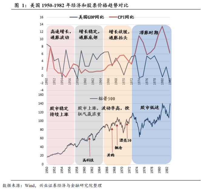 二战之后,美国经济迅速恢复,在以原子能和电子信息技术的发明与应用为先导的第三次科技革命带动下,五、六十年代经济高速发展。一直到1973年石油危机带来的滞胀,1950s股票市场稳步上涨,60年代虽然股票市场仍处于上涨趋势,但是波动开始加大,尤其在60年代后期,经济增速开始下滑,仍然维持3%附近的中枢,但核心通胀已开始上升,市场波动更大,投机氛围更加浓重。在漂亮50泡沫产生之前,股市在60年代依次经历过新兴产业、并购到概念类股票的泡沫阶段。