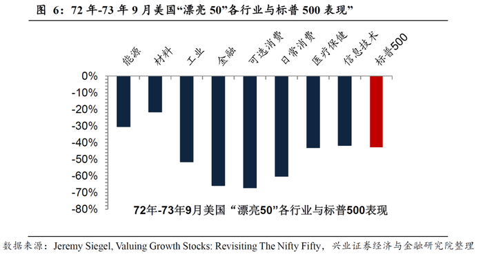 泡沫破灭诱因在于石油危机引发的滞涨带来整个资本市场的下跌,“漂亮50”的高估值不再。1973年3月,布雷顿森林体系完全崩溃,美元大幅贬值。同年十月战争爆发,欧佩克为制裁西方,联手削减石油出口量,石油价格首次出现大幅度提价,国际油价从每桶3美元涨到12美元。美元贬值和油价飙升带来的输入型通胀使本就处在宽松政策下的美国的通胀率迅速提高。为应对空前的通胀,美联储不得不再次提高利率,从而降低了市场流动性。同时过高的通胀和不断提高的融资成本在逐渐侵蚀企业的利润。股市由牛转熊,被严重高估的漂亮50泡沫成分最大,因此下跌也最惨。从72年底市场高点到74年9月市场低点,美国“漂亮50”组合50只股票的算数平均跌幅是50%,同期标普500全收益指数下跌43%。