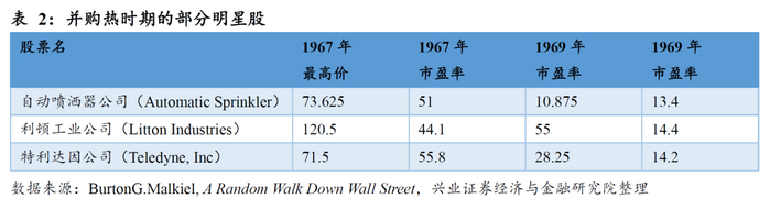 1960s中期,市场热点转向并购类股票,尤其是跨行业并购,高估值企业通过不断并购来提升业绩,进而提升股价。此次并购股票炒作热潮在1968年前后结束,标志性事件包括,1968年中,并购概念明星股票Litton Industries宣布业绩不达预期;1969年Saul Steinberg试图收购ChemicalBank失败。同时利率大幅上升,也是并购降温的重要因素。