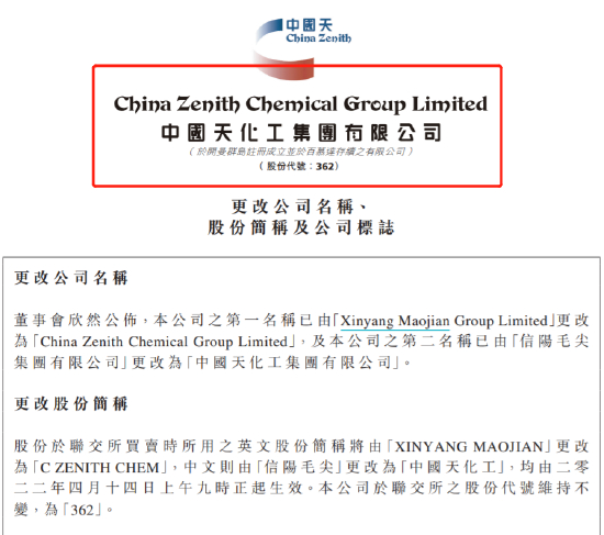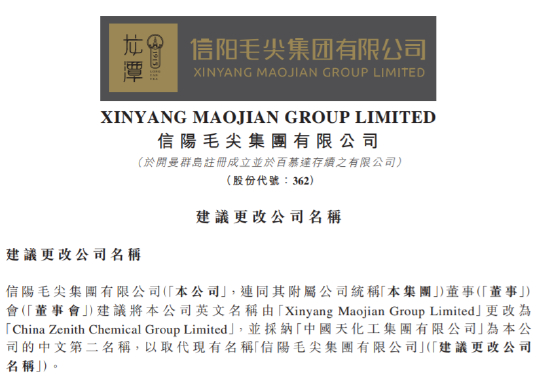 消停了半年后,此前蹭“茅台”的“信阳毛尖”叕改名了。信阳毛尖4月11日在港交所发布公告称,简称将变更为“中国天化工”,4月14日生效。