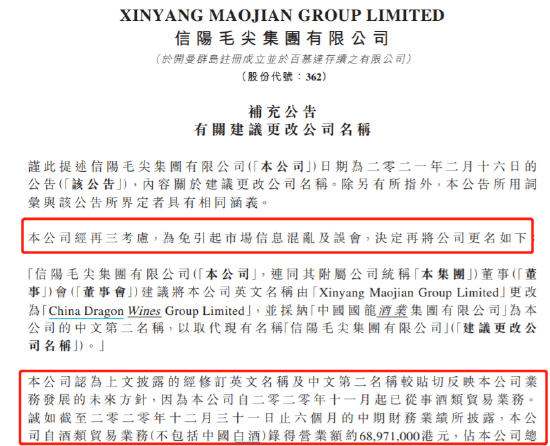 2021年2月22日,公司再发公告表示,经过公司再三考虑,为免引起市场信息混乱及误会,决定将公司名字更改为中国国龙酒业集团有限公司。公司认为,该名字较贴切反映公司业 务发展 的未来方针,因为公司自2020年11月起已从事酒类贸易业务。截至2020年底6个月财报,公司自酒类贸易业务(不包括中国白酒)录得营业额约6897.1万港元,占公司总营业额逾30%及贡献溢利428.6万港元。公司未来将大力扩展酒业市场业务。