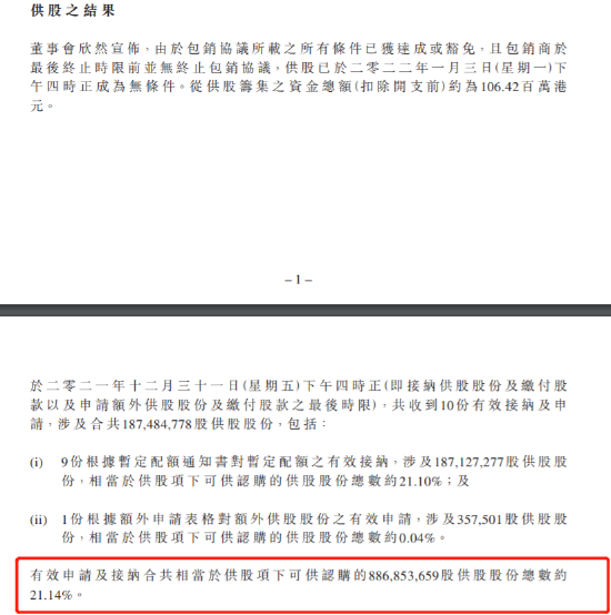 2022年1月6日,公司拟供股10亿股,筹资1.2亿港元,最终供股8.86亿股,筹资1亿港元。