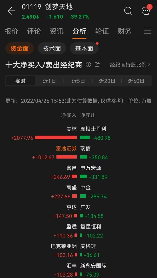 值得注意的是,截至发稿,创梦天地跌幅大幅收窄,内外资金联袂抄底,其中,公司第三大股东的美林大幅加持逾2000万股,富途证券增持逾1000万股,而砸盘的则是摩根士丹利和瑞信等经纪商。