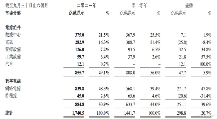 这在公司2021财年(截至9月30日止6个月)上半年的中期业绩中便有明显体现。数据显示,得益于对华讯电缆、领先工业的收购整合,网络电线报告期内收入大增47.8%,收入占比提升至48.3%,是聚科技的第一大产品,汽车业务也开始录的收入。