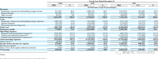 富途日前公布20-F文件,文件显示,富途2019年、2020年、2021年营收分别为10.62亿港元、33.1亿港元、71.15亿港元(约9.12亿美元)。