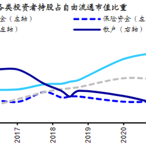 15年以来A股机构化趋势明显。从长期趋势来看,2015年底至今A股机构投资者占比稳步提升,例如公募基金的占比从15Q4的8.0%提升至21Q4的15.5%,外资占比从2.2%升至9.5%,险资占比从3.6%升至4.7%,散户的占比则从53.9%降至36.1%。