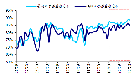 而相较快速变化的规模,19年来公募基金仓位的波动则明显减小,从基金季报披露的仓位数据来看,19Q1-22Q1普通股票型基金的仓位基本维持在85%-90%左右,同期偏股混合型基金仓位在80%-85%左右。截至5月13日,Wind估算的普通股票型基金仓位为87.1%,偏股混合型基金目前仓位为81.5%。