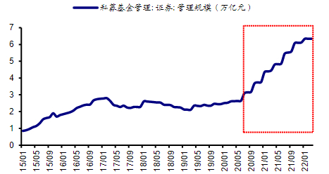 我国私募证券基金管理规模在2020年下半年开始大幅增加,从20Q2的2.65万亿迅速扩张至22Q1的6.35万亿。