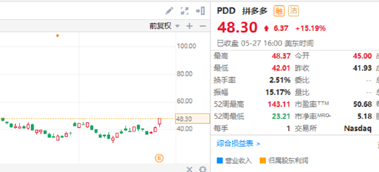 拼多多27日晚披露的数据显示,公司第一季度实现营收237.9亿元,净利润为26亿元,同比大幅扭亏。上述数据公布后,拼多多股价立马飙升,截至当天收盘,拼多多上涨15.19%。