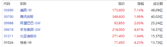 成分股中,哔哩哔哩-SW涨超7%,美团-W、舜宇光学科技、阅文集团涨超7%,小鹏汽车-W、京东集团-SW涨超4%,快手-W涨超4%,腾讯控股,阿里巴巴-SW涨超1%。