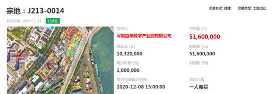 2020年12月10日,深圳百果数字产业园有限公司以底价竞得深圳市1宗工业用地,总面积3233.86平米,成交价格5160万元。