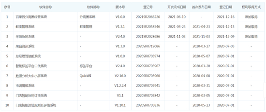 根据企查查数据(有没有可以植入睿兽的部分)显示,百果数联拥有包括百果园分商圈经营系统、鲜度管理系统、采销协同系统、果品资讯系统在内的10个软件著作权。