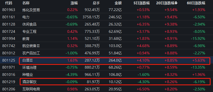 餐饮、旅游、酒店、白酒等可选消费标同样也受到政策扶持,具备困境反转的逻辑,其次是餐饮、旅游、白酒、家电等板块相比赛道股锂电、光伏具备补涨的可能性。
