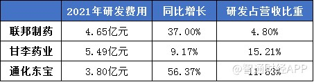2021年,联邦制药的研发费用为4.65亿元,同比增长37.0%,占同期营业收入的4.8%。与同业竞争对手甘李药业、通化东宝相比,其研发占营收比重略显单薄。