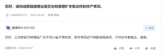 而对于是否也有像锂矿冬歇这样的停产事项会发生。公司在互动平台上回应称,参股邛崃锂盐厂位于四川省平原地带,受冬季恶劣气候影响程度低,不存在冬歇概念。