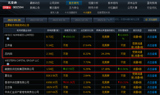公开资料显示,吕向阳个人仍是比亚迪第三大股东。截至2021年底,吕向阳持有比亚迪A股股份2.39亿股,持股比例达8.22%。而吕向阳与其妻子张长虹共同控制的融捷集团,还是比亚迪第五大股东,持股1.54亿,持股比例达5.29%。也就是说,吕向阳夫妻持有比亚迪股份占比为13.51%。