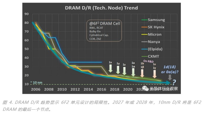 图 4 显示了主要厂商的 DRAM 设计规则 (D/R) 趋势。如果他们保持 6F2 DRAM 单元设计以及1T+1C 结构,2027 年或 2028 年 10nm D/R 将是DRAM 的最后一个节点。DRAM 单元微缩将面临若干挑战,例如 3D DRAM、减少row hammer(电路)、低功耗设计、刷新降低和管理刷新时间、低延迟、新功函数材料、HKMG 晶体管和片上 ECC。最受欢迎的功能将是“速度”和“感应裕量(sensing margin)”。三星用于 DDR5 和 GDDR6 的 HKMG 外围晶体管技术就是增加 BL 感应裕量和速度的一个例子。