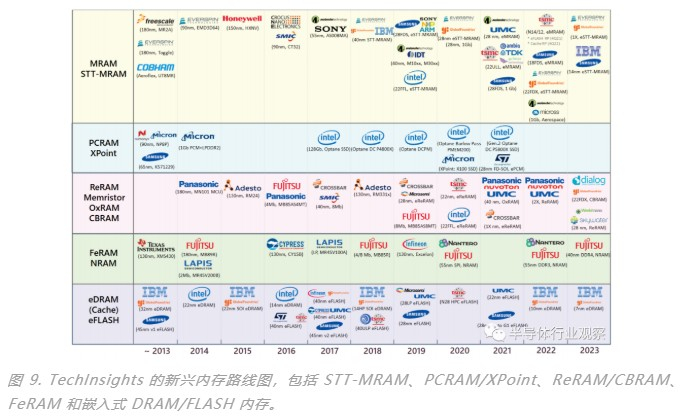 在新兴存储器件中,STT-MRAM 技术已被主要厂商/开发商积极研究和开发,例如 Everspin Technologies、GlobalFoundries、Avalanche Technologies、索尼、美光、IMEC、CEA-LETI、应用材料、三星、富士通、IBM、台积电和自旋转移技术 (STT)。英特尔、美光和 SK 海力士正专注于具有 PCM/OTS 单元结构的 XPoint 内存。美光于 2021 年退出 XPoint 内存(图 9)。