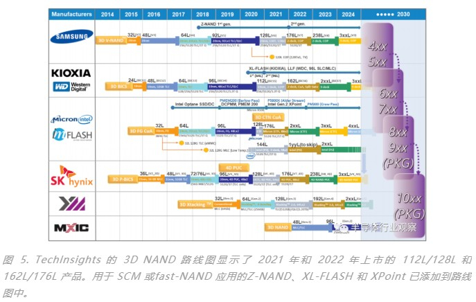 主要的 NAND 芯片制造商正在竞相增加垂直 3D NAND 门的数量。他们已经推出了最新的 1yyL 3D NAND 设备。三星176L(V7)、铠侠/西部数据 162L(BiCS6)、美光176L(2nd CTF)、SK海力士176L(V7)用于1yyL产品,2021年和2022年长江存储128L Xtacking TLC和QLC产品已经上市(图 5)。MXIC 还宣布了他们的第一个 48L 3D NAND 原型,将于 2022 年底或 2023 年初量产。