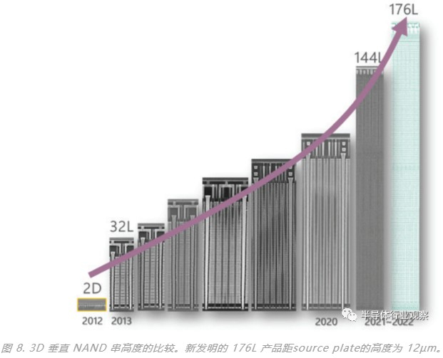 随着堆叠栅极数量的增加,垂直 NAND 串的高度也会增加。例如,新发明的 176L 产品显示距source plate 12µm 的高度(图 8)。QLC 芯片的位成本持续下降,位密度增加到 15Gb/mm2。每个 NAND 串的门总数也增加到 200 个或更多。