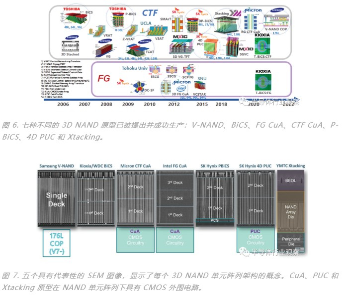自 2018 年以来,全球大多数智能手机都使用 3D NAND 存储组件而非 2D NAND 芯片。迄今为止,已经提出并生产了七种不同的 3D NAND 原型:三星的 V-NAND、铠侠(旧东芝存储器)和西部数据的 BiCS、英特尔/美光的 FG CuA、美光的 CTF CuA(128L~)、P – SK海力士 的 BiCS (~72/76L)、SK海力士的 4D PUC (96L~) 和 长江存储的 Xtacking(图 6 和图 7)。
