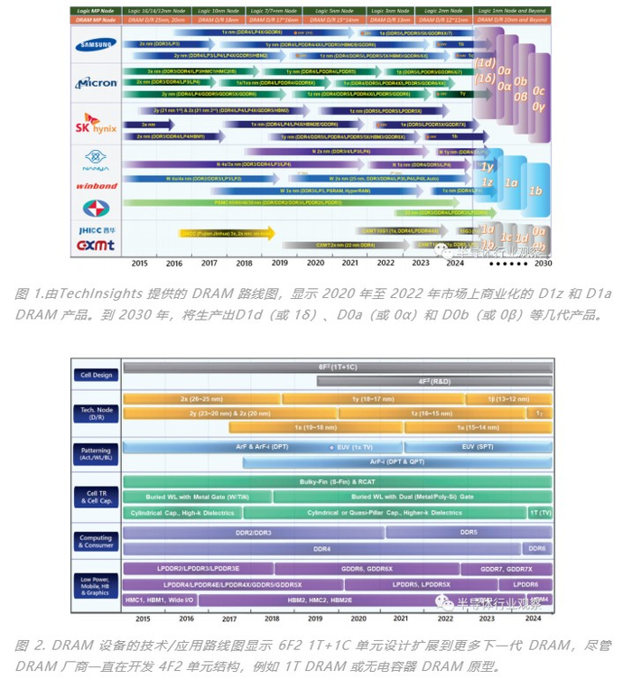 到目前为止,已经有了 8F2 和 6F2 DRAM 单元设计,其中单元包括 1T(晶体管)和 1C(电容器)。这种 1T+1C 单元设计将用于未来几代 DRAM 的 DRAM 单元设计。然而,由于工艺和布局的限制,DRAM 厂商一直在开发 4F2 单元结构,例如 1T DRAM 或无电容器 DRAM 原型,作为扩展 DRAM 技术的下一个候选者之一(图 2)。具有 B-RCAT 结构的大块鳍(或鞍鳍)用于单元存取晶体管,然而,掩埋字线栅极材料已经从单钨层变为多晶硅/钨双功函数层,以有效控制栅极泄漏。在这种情况下,具有较低功函数的多晶硅上栅极提高了 GIDL 电场 (30%) ,增大了扩散电阻。此外,美光使用纯 TiN 栅极进行 D1z 和 D1α 代单元集成。虽然圆柱型结构是DRAM单元电容器集成的主流,但SK海力士(D1y和D1z)和三星(D1z)采用了准柱状电容器(或单面柱状电容器)结构,其中单元电容器仅外表面呈圆柱状,这导致单元电容比上一代更小。几年后,DDR5、GDDR7、LPDDR6 和 HBM3 产品将在市场上普及。