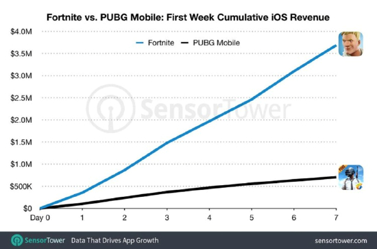 根据Sensortower的数据,腾讯旗下大火的吃鸡游戏《PUBG Mobile》在开始商业化的第一周,在IOS的收入仅70万美元。另外,国外人气极高的游戏《堡垒之夜》在上线后的首周收入也仅有370万美元。
