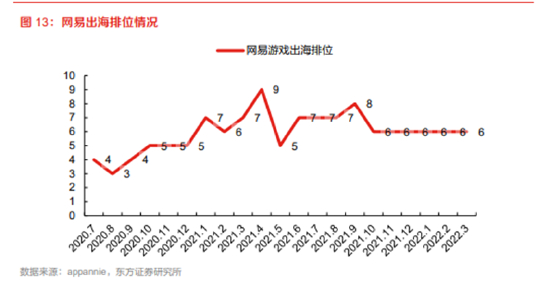 在5月的业绩电话会上,网易创始人丁磊表示,当前网易游戏海外市场的营收已经达到10%以上,未来,希望海外市场占比能达到40%-50%。拥有远大愿景的网易,目前在出海方面仍较为落后,2022年Q1的出海流水排名基本稳定在第六名。