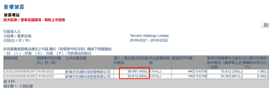 其中,6月15日,腾讯控股出售了3561.25万股,占持股比例的5.48%,出售均价为9.618港元/股。