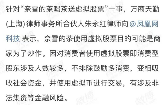 有律师判断,这种虚拟股票会鼓励用户多消费,可能会有变相吸收社会资金的问题。而奈雪币、奈雪虚拟股票也有涉及擅自发行证券,非法集资的风险。