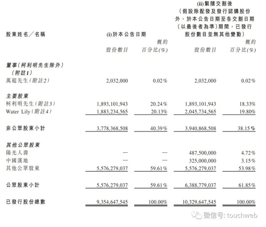 此次认购前,柯利明持股为20.24%,Water Lily持股为20.13%;此次认购后,柯利明持股为18.33%,Water Lily持股为19.8%;阳光人寿持股为4.72%,中国汉地持股为3.15%。