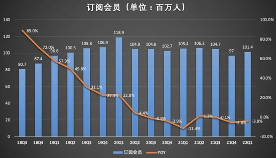 根据爱奇艺2022年一季度披露的订阅会员规模为1.014亿,较2021年第二季度1.189亿的峰值,减少了1750万。这说明,爱奇艺对用户的吸引力和留存力不足。