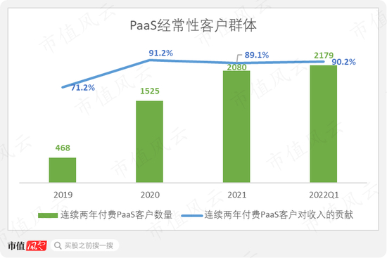 从2020年新冠疫情开始,经常性客户群体对PaaS收入的贡献就稳定在90%左右。但是经常性客户的数量增速在2021年明显放缓,仅增加了36%,今年一季度同比仅增长31%。公司没有披露经常性客户的流失率。