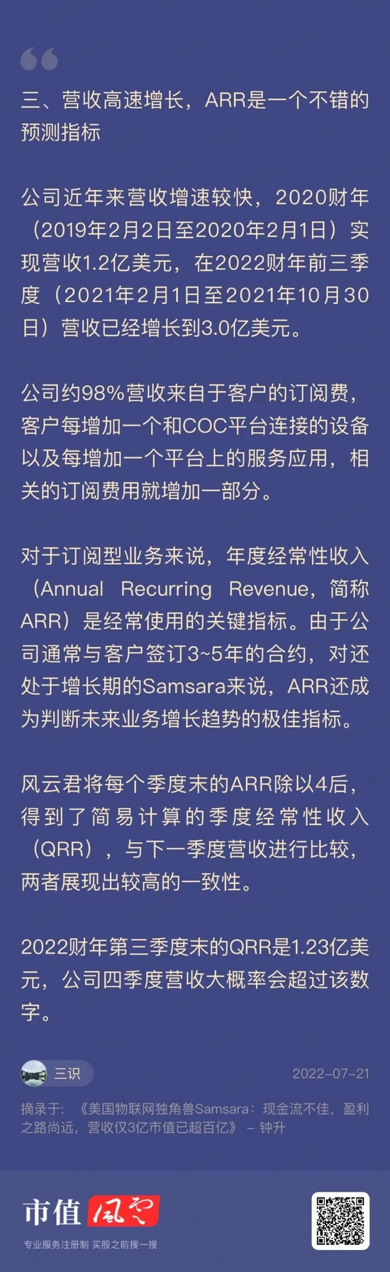 比如风云君曾经研究过的美国物联网公司Samsara(IOT.N),其为物流行业免费提供联网设备,并通过订阅费赚钱。Samsara 2022财年的年度经常性收入(ARR)达到5.58亿美元,目前市值为72亿美元(截至7月15日收盘)。