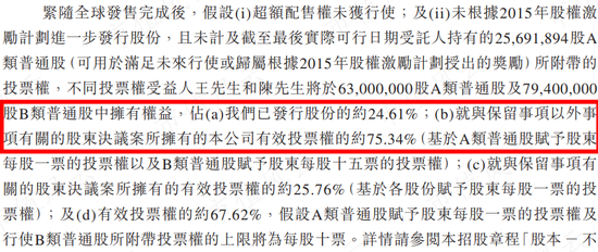 另外,王学集还持有5060万股B类股,一股B类股投票权相当于15股A类股,陈燎罕持有剩余2880万股B类股,两人合计拥有公司75.34%的投票权(保留事项除外)。