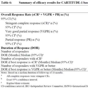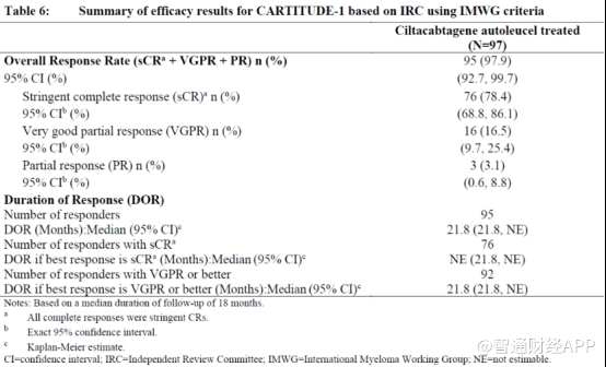 研究结果显示,中位随访12.4个月时,独立委员审查的ORR为97%,包括67%的sCR(严格的完全缓解),26% 的VGPR(非常好的部分缓解)和4%的PR。≥3级细胞因子综合征(CRS)发生率为5%,≥3级神经毒性发生率为10%。