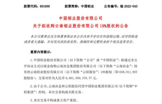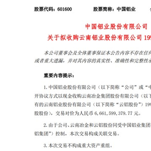 需要注意的是,由于中国铝业、云南冶金和云铝股份同受中铝集团控制,本次交易构成关联交易。而中国铝业表示,此次交易有利于进一步解决公司与云铝股份的同业竞争问题,有效减少公司的日常关联交易。