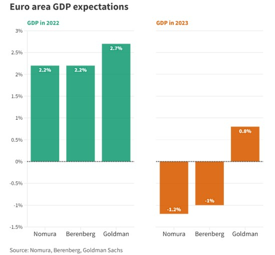 尽管欧盟委员会本月早些时候表示,今年整体经济将增长2.7%,明年将增长1.5%。然而,该机构也警告称,俄罗斯完全断供天然气可能会在2022年晚些时候导致经济衰退。