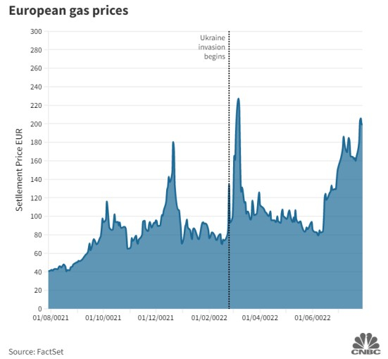 欧亚集团咨询公司分析师在一份研究报告中表示:“由于公用事业公司竞购替代供应,荷兰产权转让设施(TTF)的欧洲基准天然气价格飙升15%,接近200欧元/兆瓦时,这引发了市场对消费者和行业将难以支付能源账单以及将在冬季陷入经济衰退的担忧。”