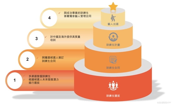 具体而言,为业内熟知的“乐华模式”实则指的是一套涵盖训练生选拔、艺人培训、艺人运营及艺人宣传在内的,覆盖艺人管理全生命周期的系统化模式,主要具备以下几个特点:长周期、严苛的考核评估体系、系统全面的管理生态。