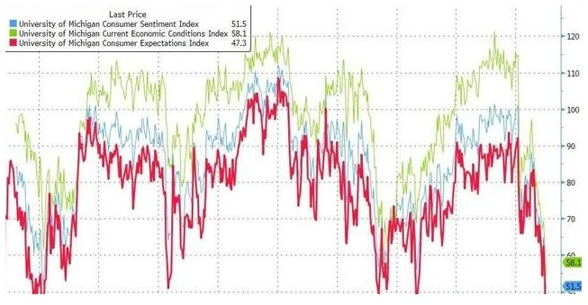 美国密歇根大学统计的数据也显示,7月美国消费者信心指数终值为51.5,虽略高于6月终值50.0,但仍是该数据有记录以来第二低的读数。此外,同期公布的消费者预期指数为47.3,较6月指数47.5有所下降。