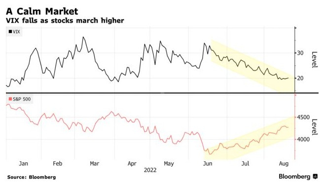 一路上,交易员们蜂拥至看涨期权市场,以赶上股市出人意料的反弹。在平衡账目时,期权交易商被困在“long gamma”(指做多波动率)头寸中,这使得他们需要逆着当前的股票趋势保持中性的市场敞口。因此在这一进程的一定作用下,市场恢复了平静。据芝加哥期权交易所(CBOE)波动率指数VIX显示,该指数在8月份的平均水平为21,有望达到去年11月以来的最低水平。