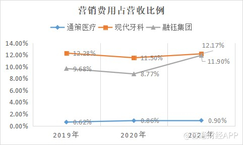 对于销售费用始终居高不下、以营销驱动业绩增长的公司,其业绩的可持续性往往要打上一个问号。与同业相比,现代牙科销售费用占营收比例持续处于较高水平:2019-2021年间,供公司销售及分销成本分别为2.64亿、2.12亿和2.94亿,高于同为牙科医疗股的通策医疗和融钰集团(002622.SZ)。