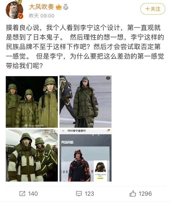 一位法律博主“大风吹奏”表示,“摸着良心说,我个人看到李宁这个设计,第一直观感受就是想到了日本鬼子。然后理性的想一想,李宁这样的民族品牌不至于这样下作吧?然后才会尝试取否定第一感觉。但是李宁,为什么要把这么差劲的第一感觉带给我们呢?”