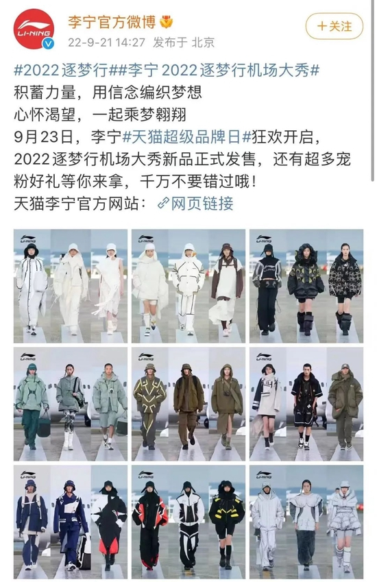 9月20日,李宁在机场举行秋冬大秀,还邀请了华晨宇、陆柯燃、傅菁等明星。