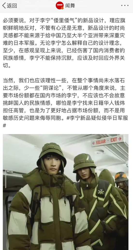一位名为闻舞的大V认为,对于李宁“倭里倭气”的新品设计,理应旗帜鲜明地反对,无论李宁怎么解释自己的设计理念,至少,在感观呈现上来说,已经伤害了国内消费者的民族感情,李宁不能保持沉默,应该及时回应外界关切。当然,我们也应该理性一些,在整个事情尚未水落石出之际,少一些“阴谋论”,不管从哪个角度来说,主要市场份额都在国内市场的李宁,不应该也不会故意挑衅国人的民族情感,哪怕是李宁找来日籍华人钱炜担任高管,也是为了更好地占据市场份额,而不是用敏感历史问题来侮辱同胞。