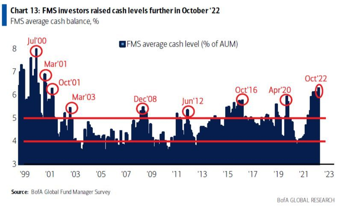 美国银行10月发布了一份关于市场投降的报告,其中一张图表显示,历史上现金余额激增一直被当作市场看涨的信息。一旦几乎所有想要卖出的人都已抛售,股市就不太可能进一步下跌,投资者囤积的资金最终将重新进入股市。投降可能只发生在股市,也可能同时出现于债市和大宗商品市场。
