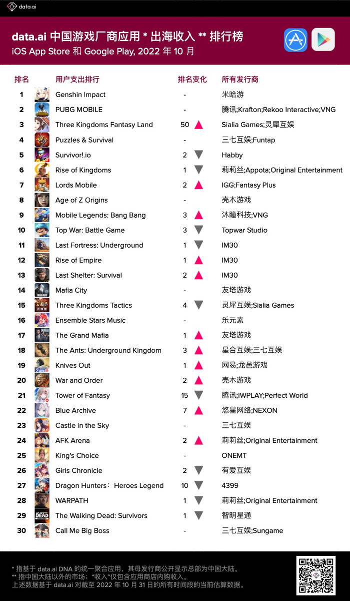 根据data.ai的估算数据,10月游戏出海应用收入榜单头部位置,米哈游《原神》和腾讯《绝地求生》(PUBGMobile)分别位列榜单第一、第二,与九月排名情况一致。《三国志幻想大陆》排名出现显著上升,前进50名,一跃进入榜单前三位置。《三国志幻想大陆》是一款团队战斗(角色扮演)游戏,该游戏的繁体中文版本由Sialia Games于10月发行上线,在2022年10月成为全球收入第一的团队战斗(角色扮演)游戏,击败了其他流行的同类游戏,如Fate/Grand Order和DRAGON BALL LEGENDS。同时,《三国志幻想大陆》也在2022年10月进入全球游戏收入排名前二十(按全球所有发行商排名)。Habby《Survivor!.io》的排名虽然出现小幅下滑,仍居第5,保持榜单头部位置。《Mobile Legends: Bang Bang》排名上升3位至榜单第9,挺进10月出海应用收入榜前十。