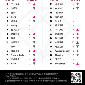前30名中,进步最大的是心动网络,排名上升10名夺得第25名。作为十月收入排行榜中,表现最为显著的中国游戏厂商,其排名上升的主要源于心动网络研发的ARPG手游《Torchlight: Infinite》(火炬之光:无限)。该游戏已于10月中旬在海外市场正式上线,自上线以来,在iOS应用商店,《火炬之光:无限》已在七个市场(包括韩国和新加坡)成功夺得日下载量排名第一,并在二十个市场进入排名第五。在总收入方面,《火炬之光:无限》已经在两个市场进入游戏收入榜单前十。在Google Play上,它在包括加拿大在内的三个市场中获得日下载量排名第一,并在六个市场中排名第五。总收入方面,《火炬之光:无限》在33个市场进入游戏收入榜前一百。