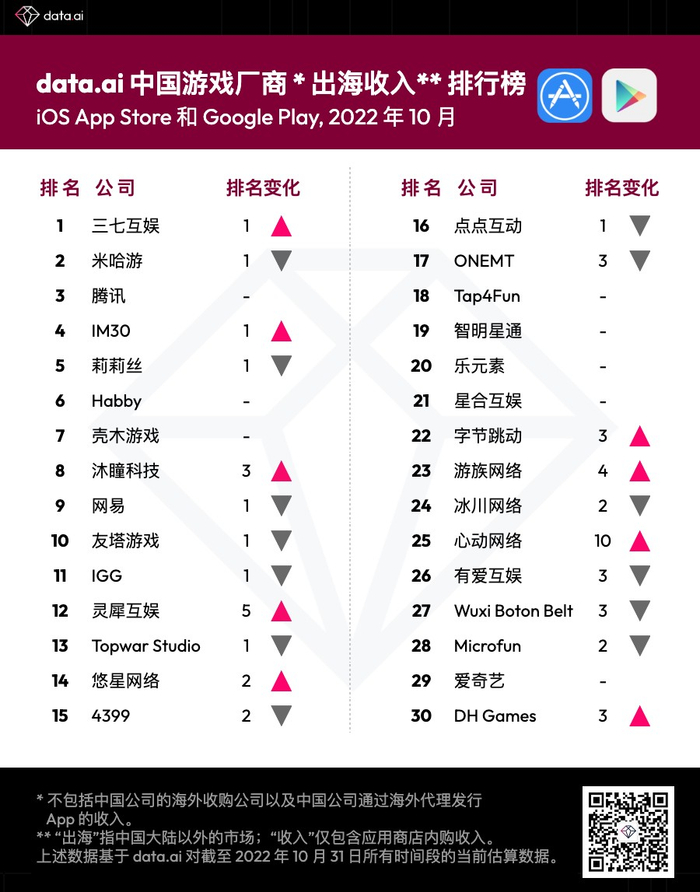 10月中国游戏厂商出海收入排行榜出炉!三七互娱(002555.SZ)、米哈游、腾讯(00700)居前三甲